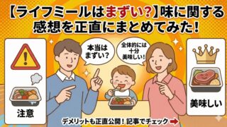 | 弁当宅配食 | ![]() | ライフミール | お弁当 | 大きい | 一食 404円〜530円 | 使うほど安い | 量が少ない | |