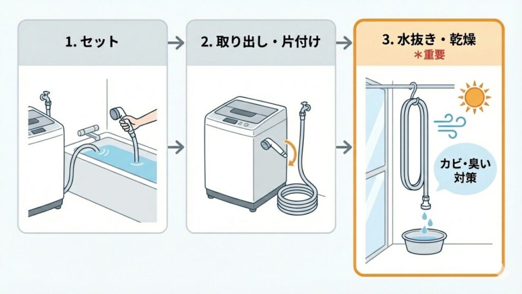 ホース内部の水を抜かないとカビや臭いの原因になるため、使用後の管理も必須。