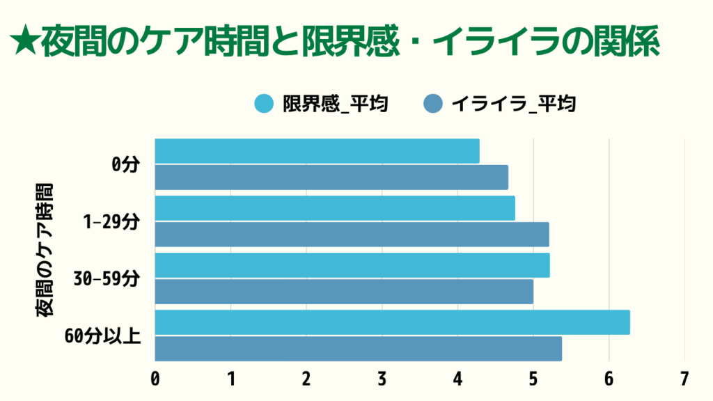 - 夜間ケアがほぼない〜30分未満の層では、「限界」と感じる人は比較的少ない