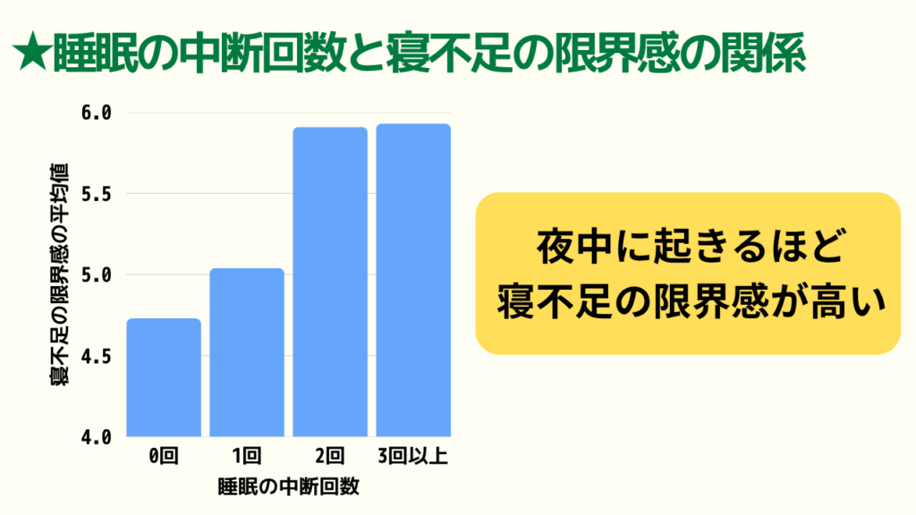 育児中はどうしても細切れ睡眠になりがちですが、この中断回数が限界感に大きく影響していました。