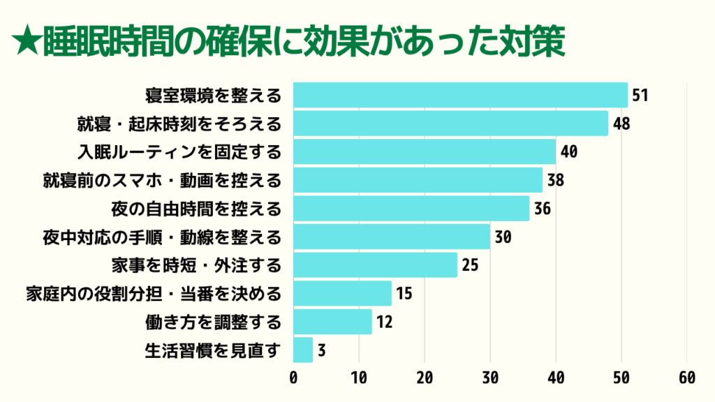 ここからは、アンケートで「睡眠時間の確保に効果があった」と答えが多かった対策を紹介していきます。