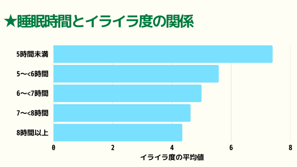 その結果、睡眠時間が短いほどイライラが高くなる傾向がはっきり見えています。