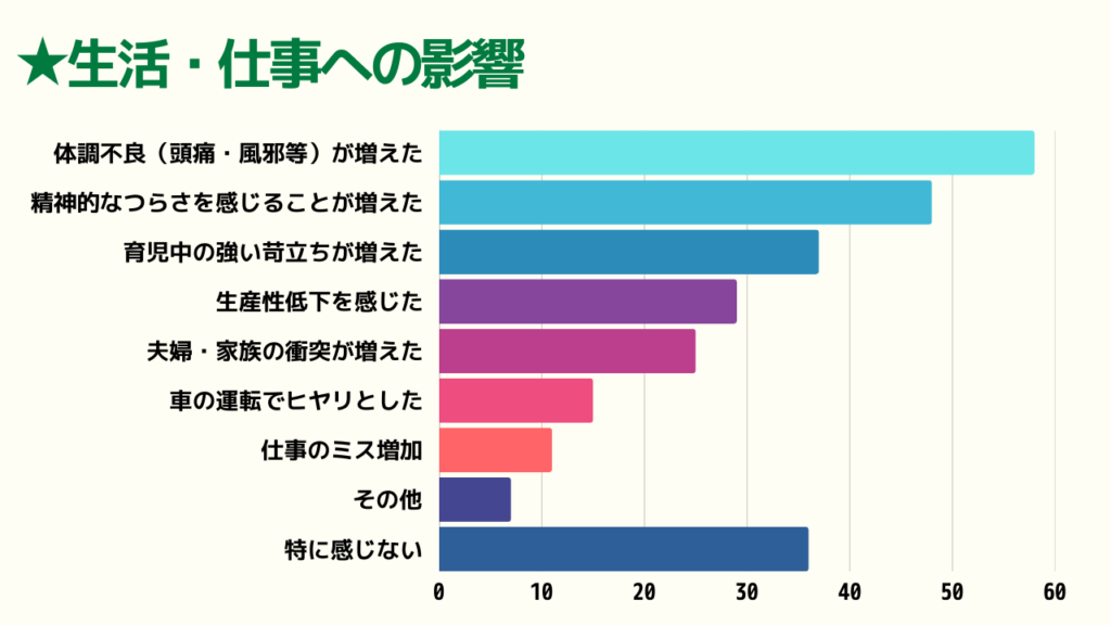 実際にどんなところに影響を感じるか調査した結果をグラフにまとめるとこんな感じでした。