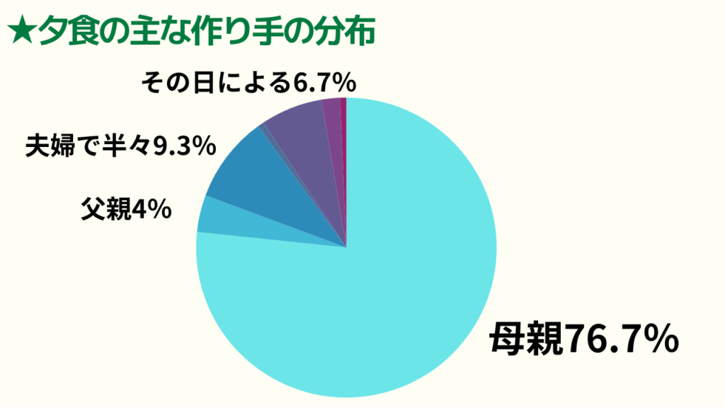 「夕食の主な作り手」の円グラフを見ると、もっとも大きな部分を占めているのは母親(76.7%)でした。