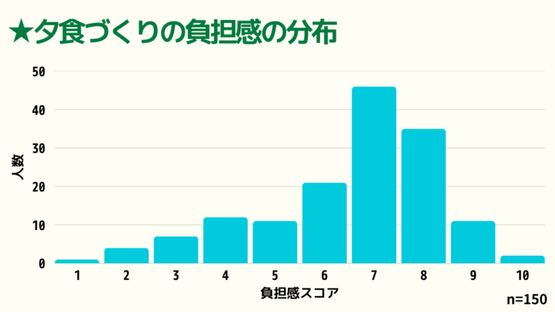 - 夕食づくりの負担感スコアは6〜8に回答が集中し、「かなり負担が大きい」と感じている人もいる。