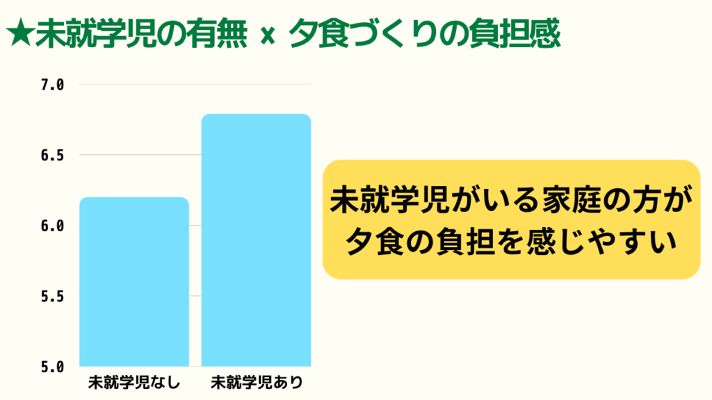 まず、「子どもの年齢帯」から未就学児がいる家庭/いない家庭に分けて、夕食づくりの負担感スコア(1〜10)の平均値を比べました。