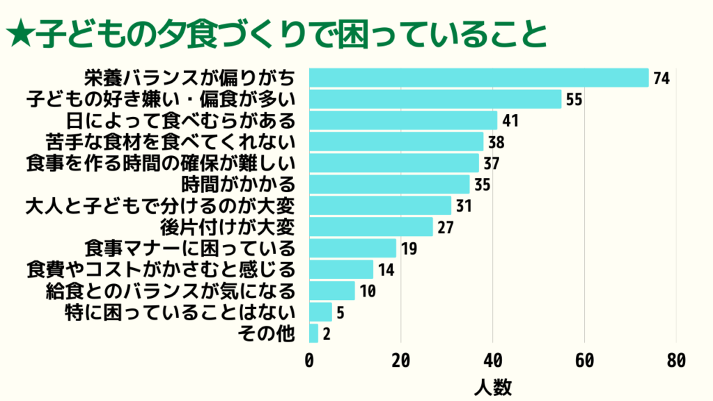 続いて、「子どもの夕食づくりで困っていること」を複数選択で尋ねた結果です。