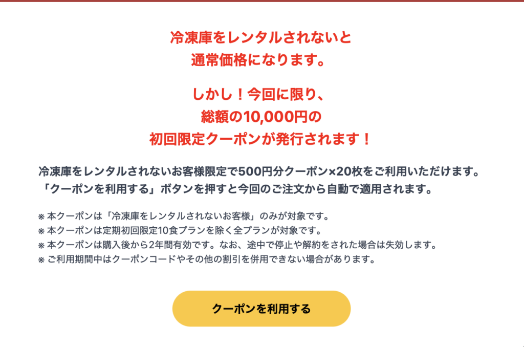冷凍庫のレンタルをしない場合、初回限定の価格にはならない代わりに、10,000円分のクーポンをゲットすることができます。