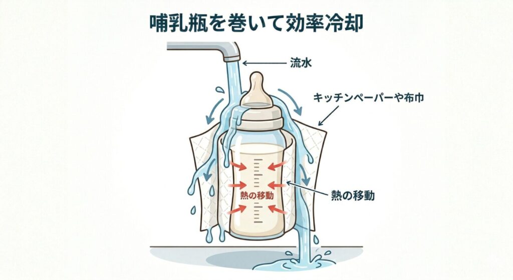 ツルツルした哺乳瓶にそのまま水をかけるより、はるかに早く冷めるのでぜひ試してみてください。