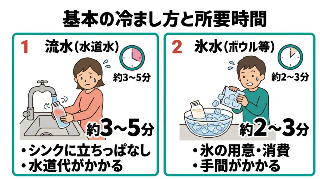 | 氷水(ボウル等) | 約2〜3分 | 氷を用意する手間がかかる。氷の消費が激しい。 |