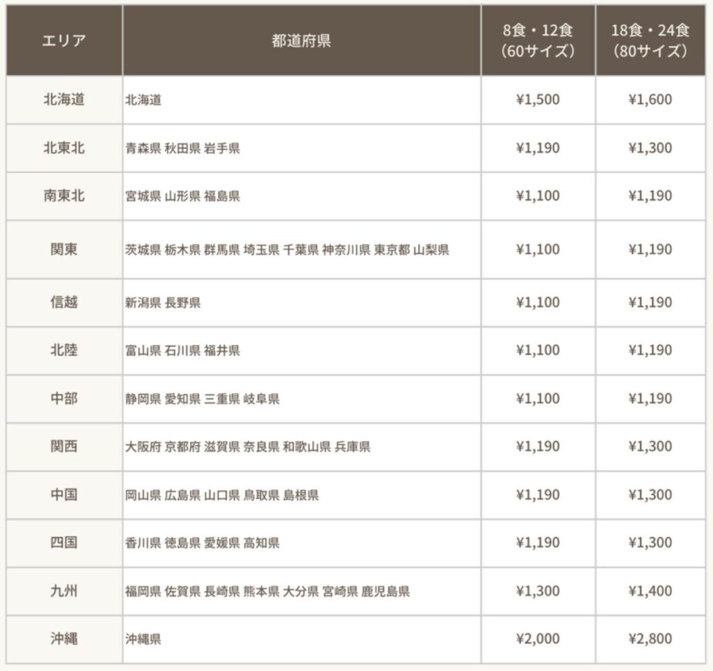 例えば、関東エリアなどの場合、8食・12食(60サイズ)の送料は1,100円ですが、18食・24食(80サイズ)になると1,190円に上がります。