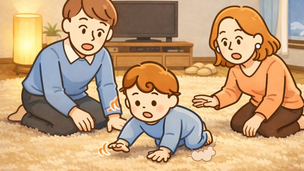わが家でも、ミルクをこぼす・ご飯粒を踏む・突然の嘔吐…など日常茶飯事だったね。