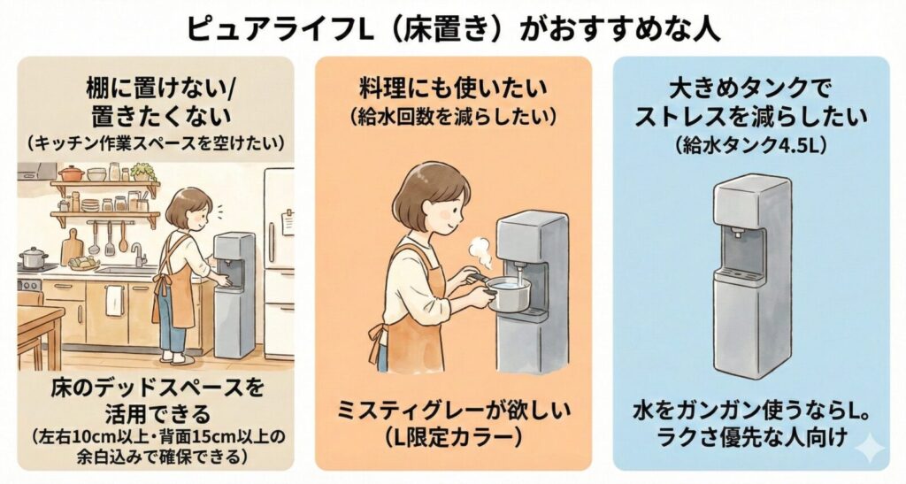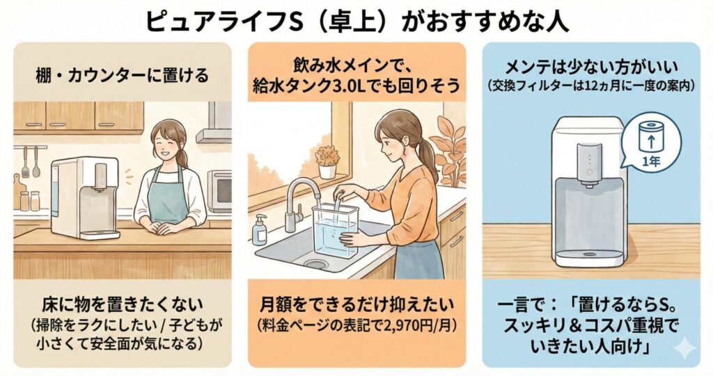 【大きな違いは3つ】ピュアライフSとLは「置き場所・給水の手間・料金とメンテ」で決まる