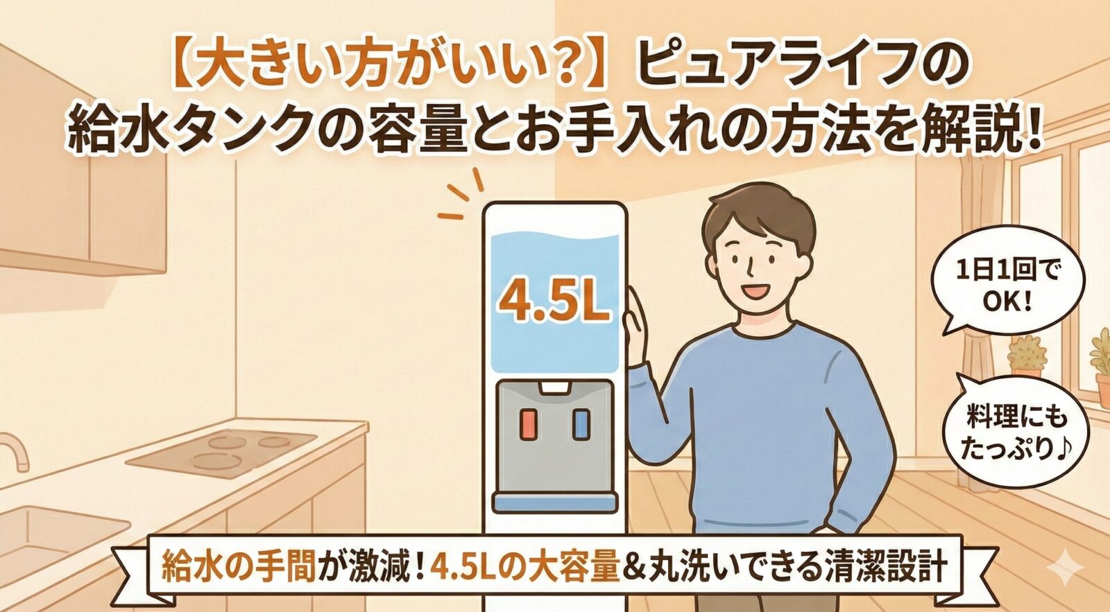 タンクの容量はピュアライフのSとLで違いますが、機能性を考えると4.5LあるピュアライフLが便利ですね。