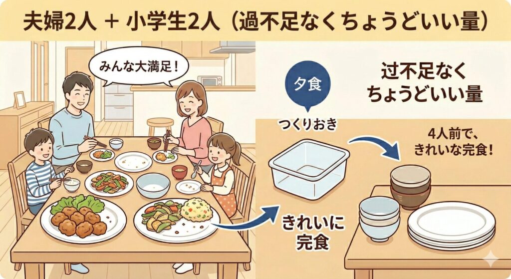 夫婦2人+小学生2人(過不足なくちょうどいい量)